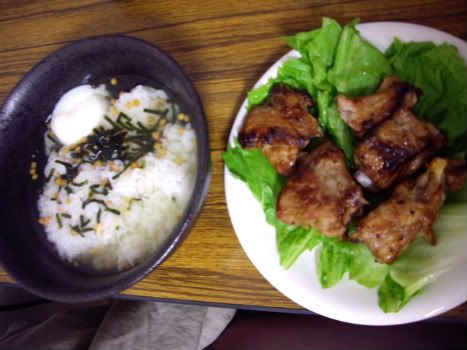 cơm chan ochazuke (gói có sẵn, vị cá hồi), sườn xào