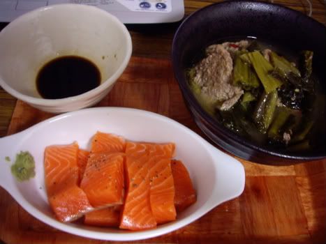 cá hồi sống, canh dưa thịt bò