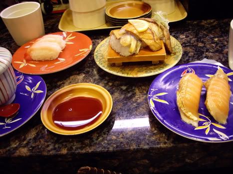 sushi, 1 cái là amaebi, 1 cái là cá hồi nướng, 1 cái ko nhớ tên