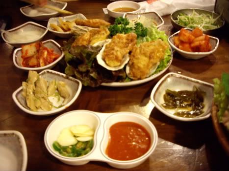 đồ hàn, món chiên là hào, rau sống gói thịt để ăn