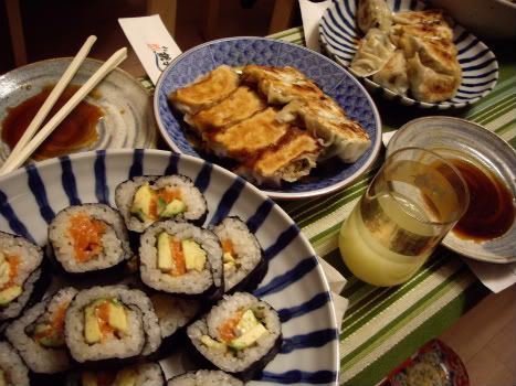 ăn ở nhà bạn, sushi cuốn cá hồi với quả bơ, gyoza