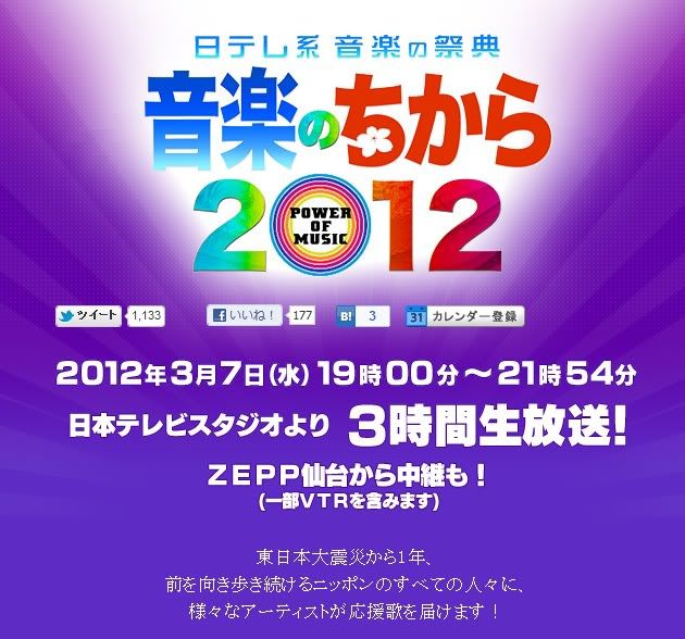 Vào ngày 7/3, NTV sẽ truyền hình trực tiếp chương trình âm nhạc đặc biệt mang tên "Nittere-kei Ongaku no Saiten Ongaku no Chikara 2012" nhằm khích lệ những nỗ lực phục hồi của người dân sau thảm họa động đất Tohoku.