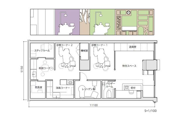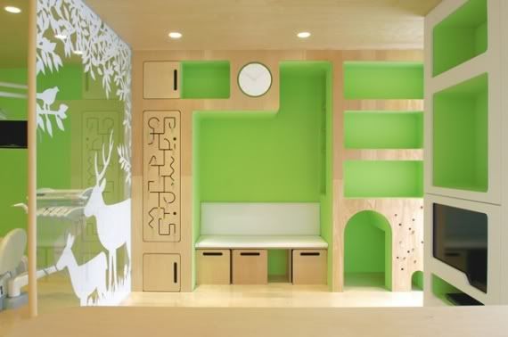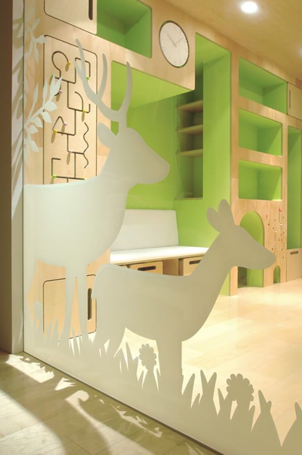 Bố cục không gian cho phép người bên trong phòng khám có thể nhìn thấy những con thú và cây cối xung quanh được vẽ trên các bức tường của không gian bên trong phòng khám, nhằm giúp các em nhỏ cảm thấy dễ chịu hơn.
