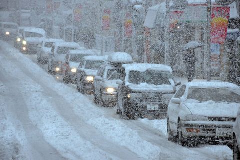 Xe cộ đi lại chậm chạp trên những con phố bị tuyết phủ trắng.