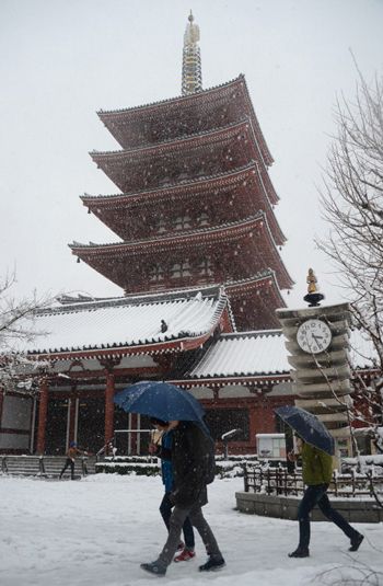 Du khách đi dưới trời tuyết rơi qua ngôi tháp 5 tầng ở đền Sensoji tại khu Asakusa ở Tokyo.