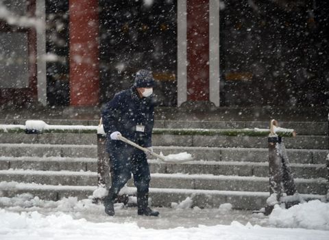 Người công nhân này khó nhọc dọn những đám tuyết dày tại đền Sensoji.
