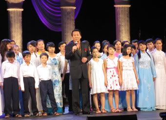 Đại sứ đặc biệt Sugi Ryotaro cùng các con nuôi Việt Nam trong chương trình Đại nhạc hội Việt - Nhật lần 2 đêm 9.10 Ảnh: N.Hoàng