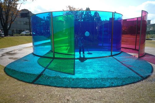 Tác phẩm nghệ thuật bên ngoài bảo tàng Kanazawa với các tấm kính nhiều màu sắc cho phép du khách tự phối màu bằng mắt thường để nhìn cuộc sống với những gam màu khác nhau