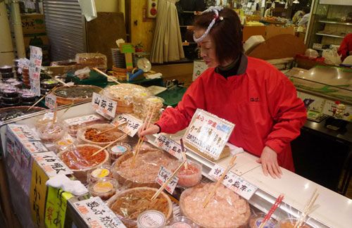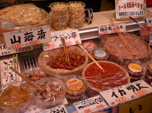 Những người bán hàng niềm nở mời khách nếm các loại cá, tôm, mực, bạch tuộc được tẩm ướp hoặc muối một cách công phu, dùng ăn với cơm hoặc uống bia, rượu sake rất hợp