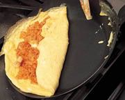 6. Khi dọn ra đĩa thì úp phần trứng đã gấp mép lại, lật mặt kia của trứng lên.