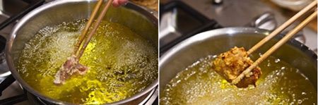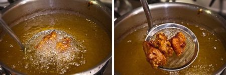 Cho dầu ăn vào chảo, chờ dầu nóng, cho từng miếng gà vào chiên đến khi vàng. |