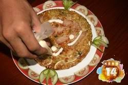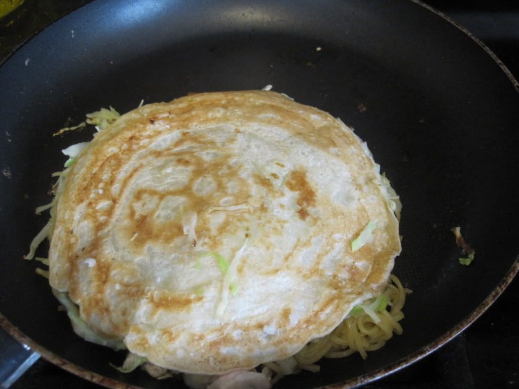 -Rũ thẳng mì yakisoba, sau đó đặt bánh okonomiyaki trên mì
