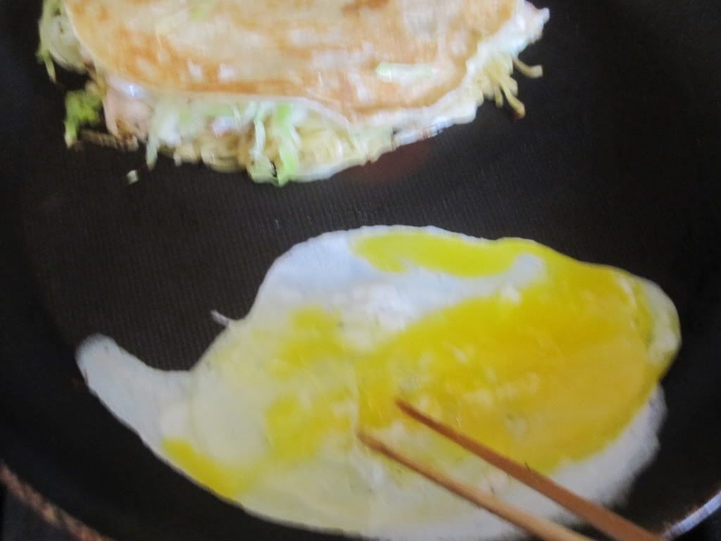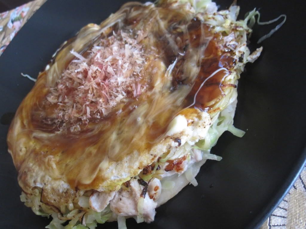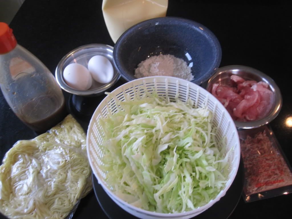 -Sau đó cho bắp cải lên trên, rồi thêm một nửa số thịt lợn, sau đó cho từ từ một nửa của bột okonomiyaki còn lại lên trên.
