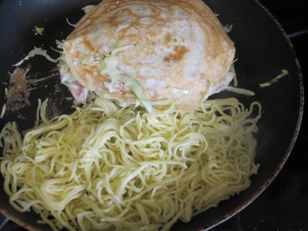 -Thêm một gói mì yakisoba okonomiyaki với một ít nước, sau đó nấu trong ba phút