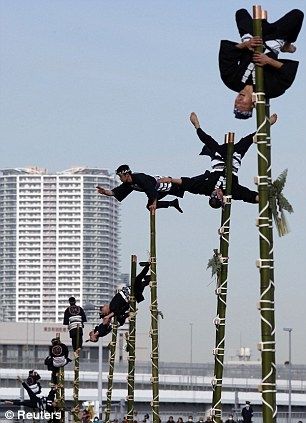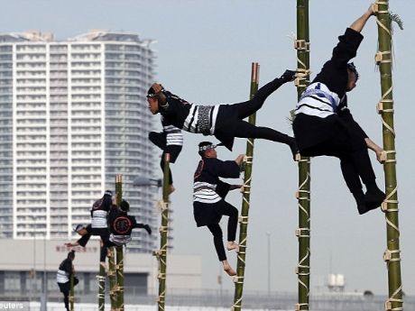 Giữ thăng bằng trên cột tre và đối mặt với đám cháy khủng khiếp là một phần của buổi diễn tập của lính cứu hỏa Nhật Bản.
